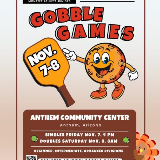 Our second of 3 Fall season tournaments will be held at the Anthem Recreation Center on Friday evening, November 7 and all day Saturday on November 8. The tournament will include two events: singles on Friday eventing and doubles on Saturday. It is included for MAJ members but the tournament is also open to non-members. Cost for non-members is a $50 registration fee and a $25 fee for each event. Events will be structured by age and skill level. To register, visit www.gobble.games.