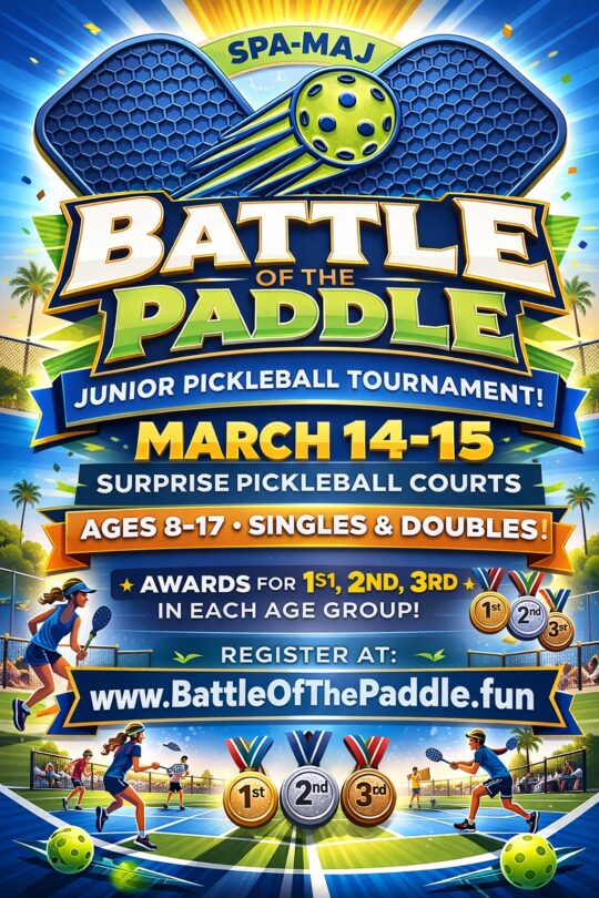 Our second tournament of the Winter/Spring season will be held at the City of Surprise pickleball courts on Saturday and Sunday, March 14-15. The tournament will feature doubles events on Saturday and singles Sunday. Events are included at no charge for MAJ members but the tournament is also open to all non-members. Cost for non-members is a $25 registration fee and a $25 fee for each event. Events will be structured by age and skill level. We will also find you a partner if you don’t have one.